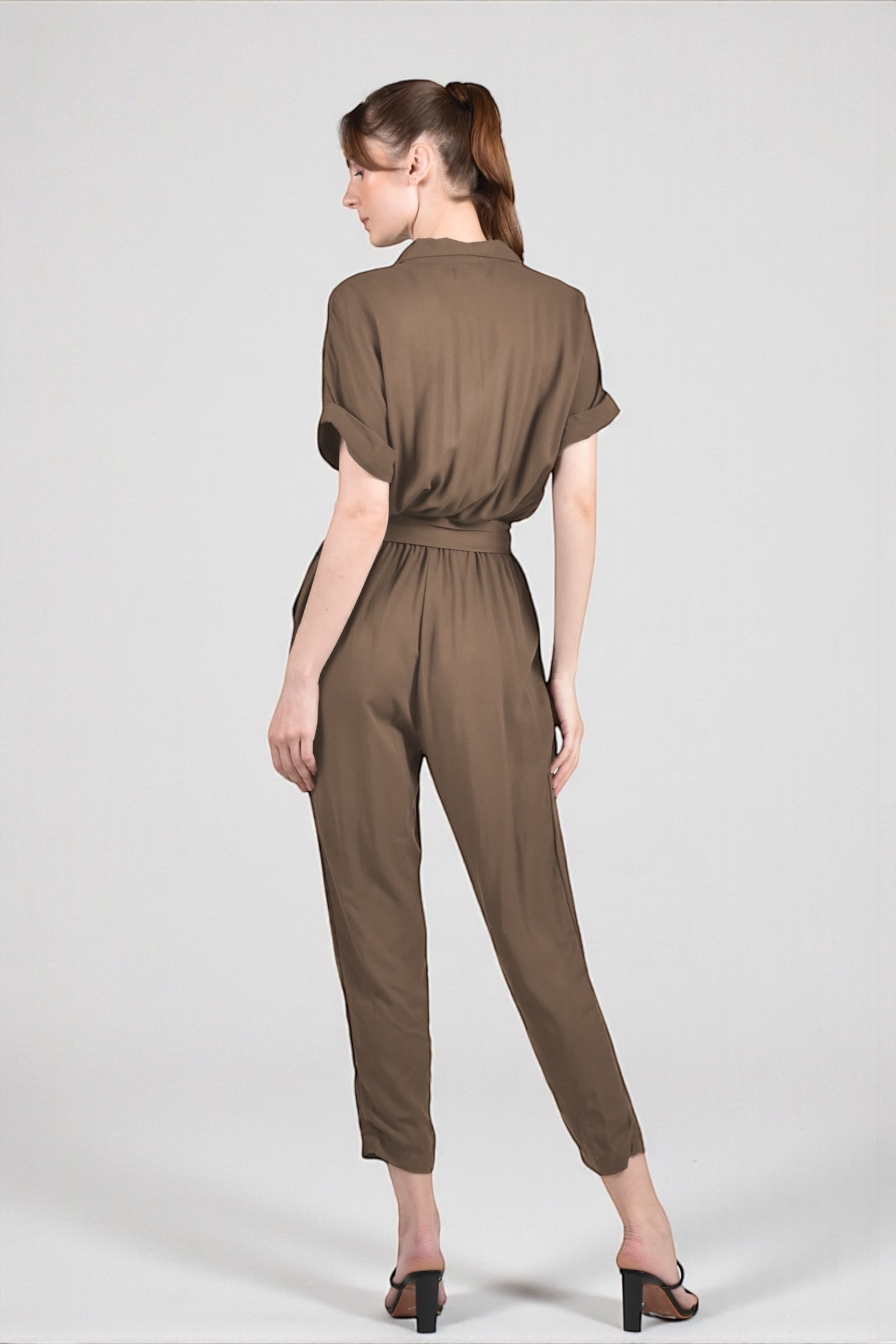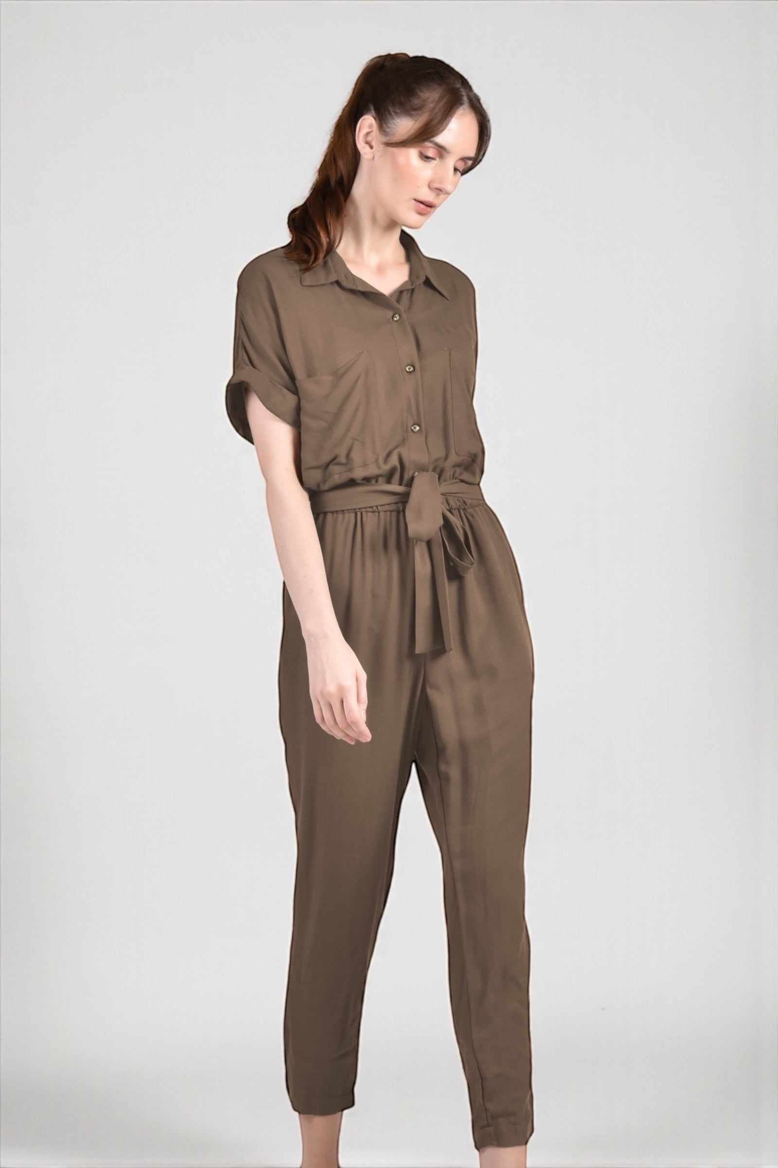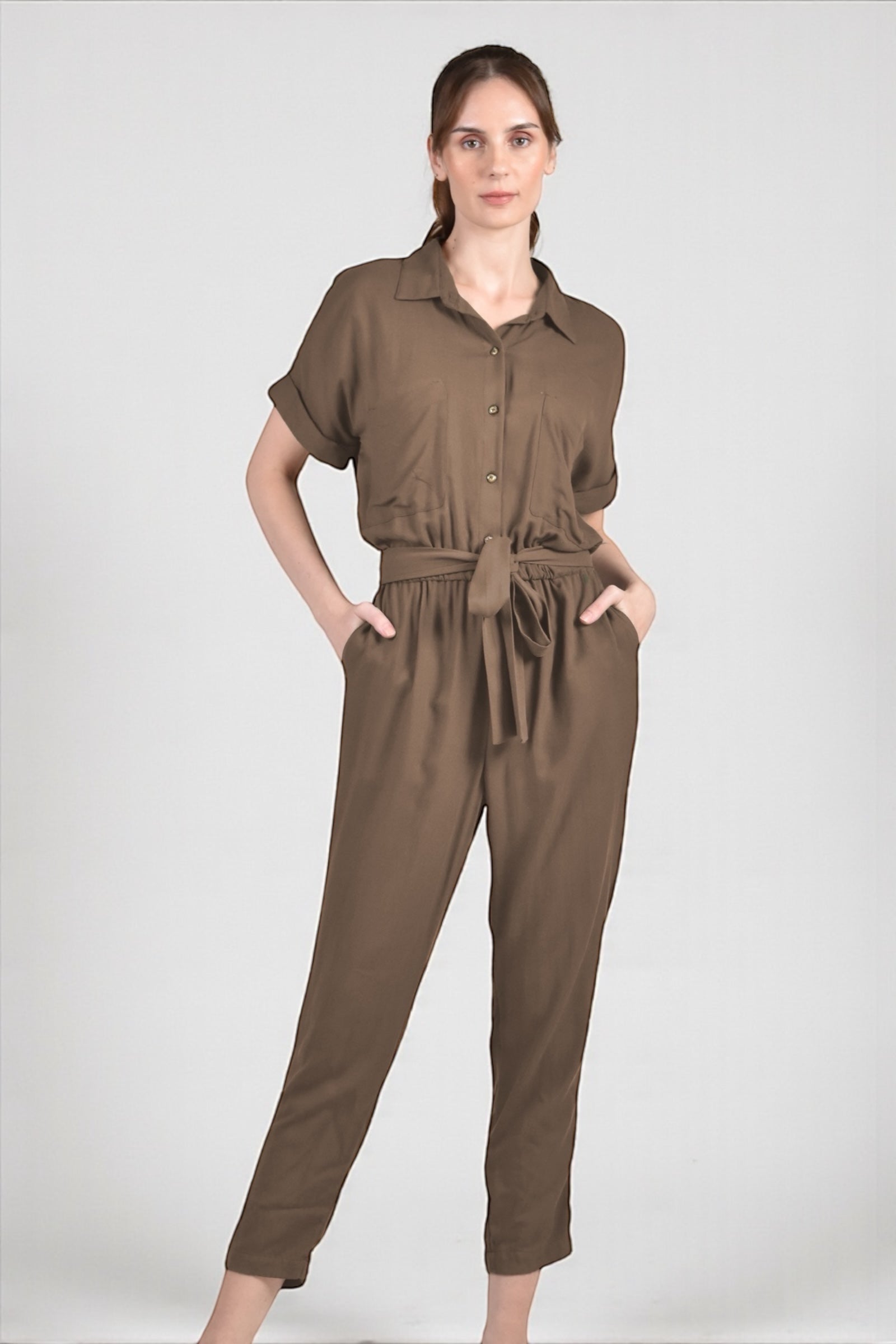 Effortlessly versatile, the ELUA Jumpsuit combines contemporary style with practical comfort. This coffee colored piece features a self-tie belt cinched at the elasticized waist, extended sleeves, and a button-front closure for easy styling. Two front pockets add functionality to the silhouette. Crafted from a soft linen polyblend, it transitions seamlessly from day to night. Pair with sneakers for an understated casual vibe or elevate with strappy heels for sophisticated evening wear.