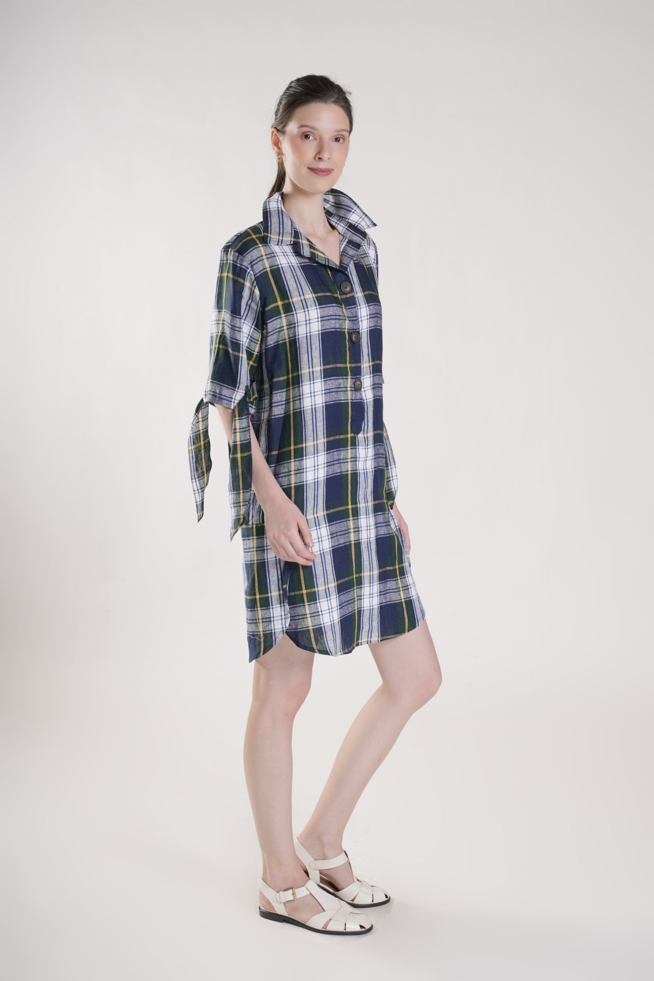 The ROSLIN Shirtdress is a chic cotton staple designed for everyday wear.  Three statement buttons anchor the front, while a softly curved hem and charming tie-detail sleeves complete an elevated shirtdress silhouette.  This is the versatile piece that makes getting dressed feel intentional and always on-trend.