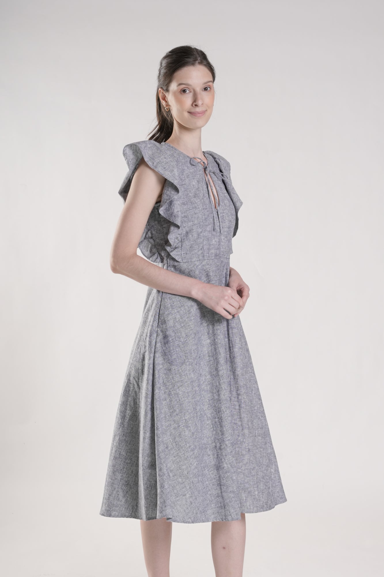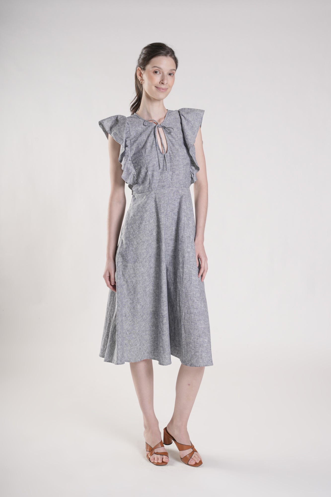 The Aiya dress features a nipped-in waist, a playful keyhole neckline with tie strings you can adjust to your liking. This charming cotton chambray piece is designed with flutter sleeves and a skirt that flows gracefully to your mid-calf. Feminine and an easy wear - this dress is made for those who love a little personality in their closet.