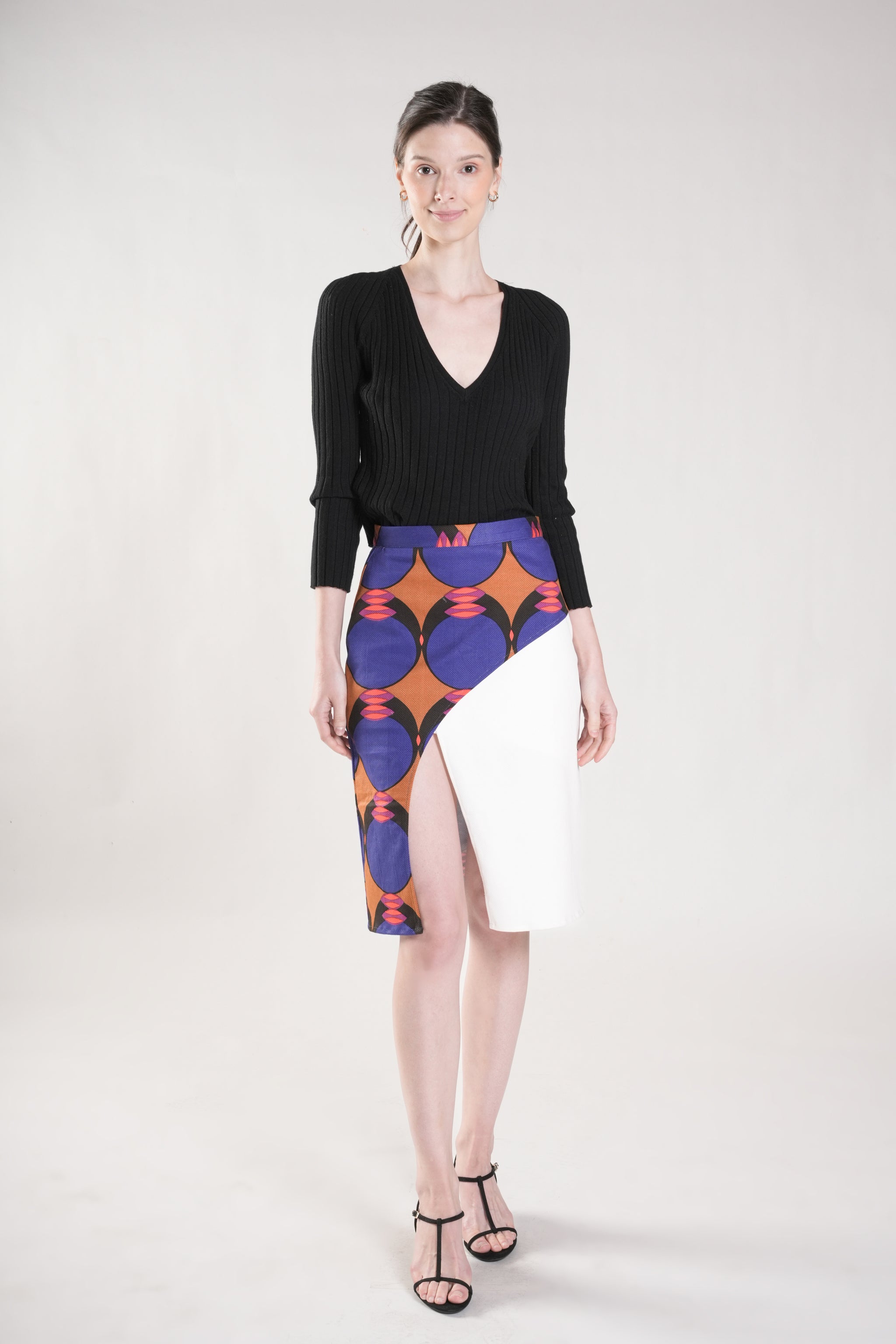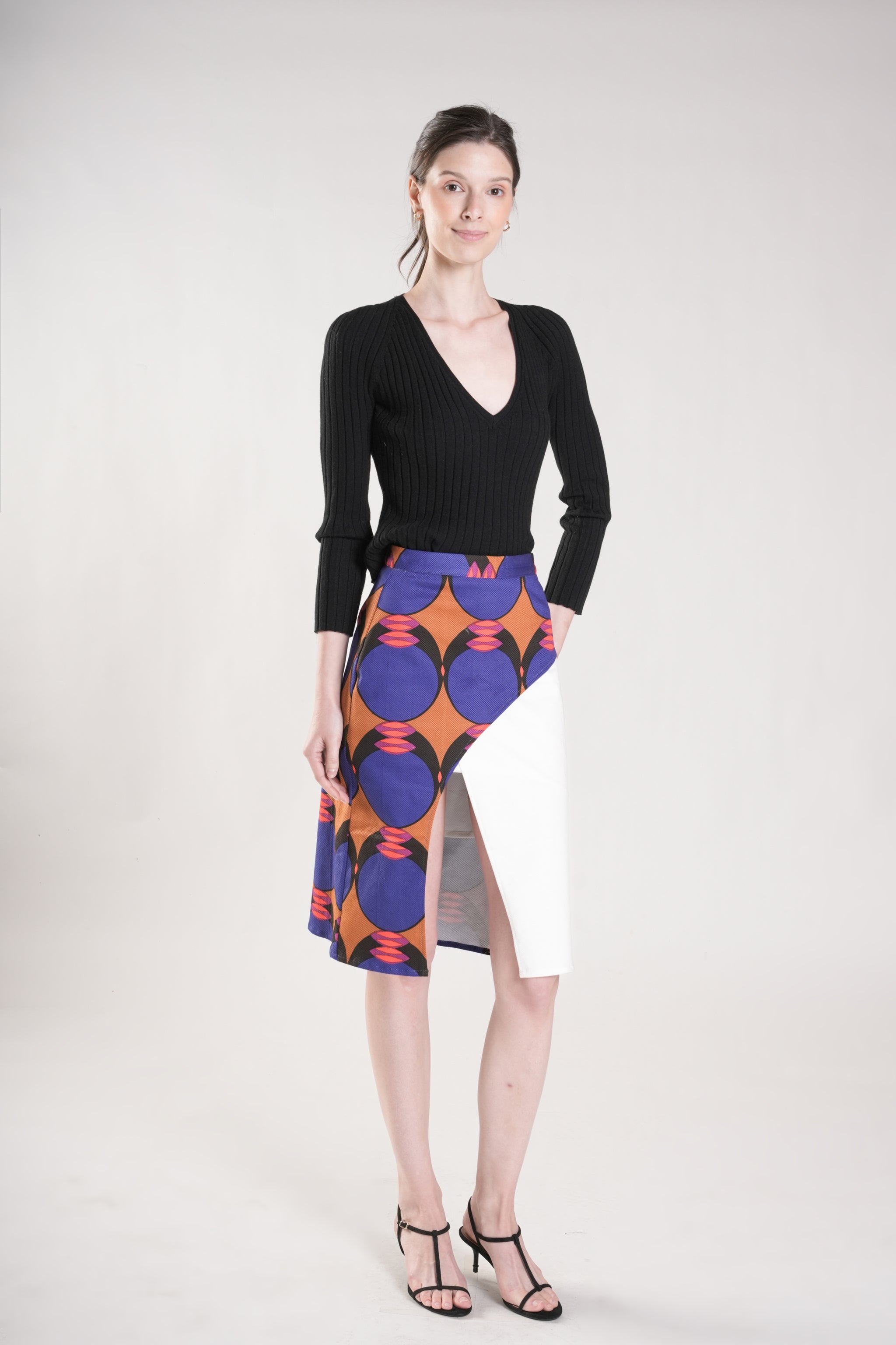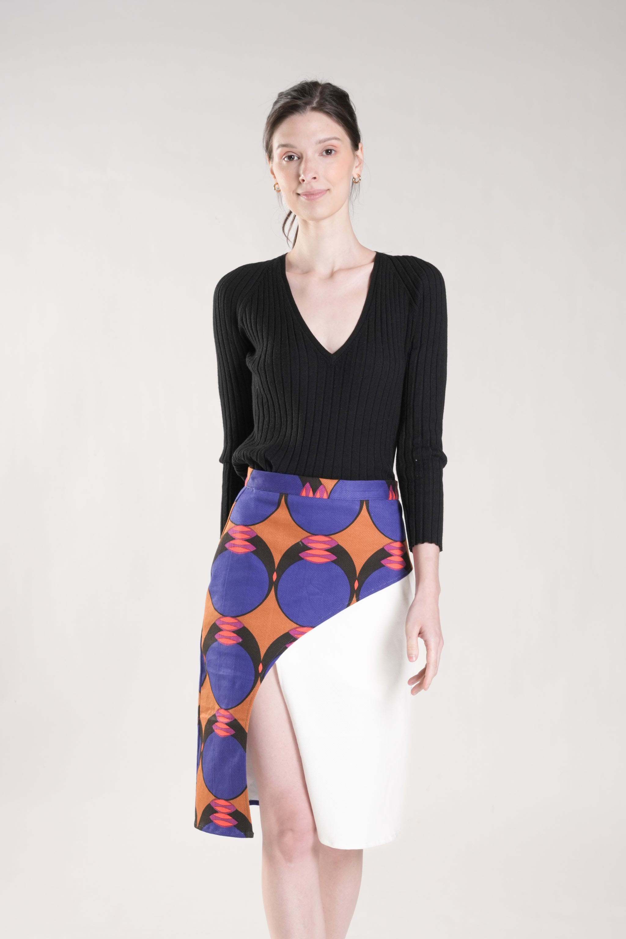 This refined faux overlap skirt features a sleek silhouette enhanced by a curved front panel. The design combines plain and printed twill fabrics, creating sophisticated visual contrast and depth. A discreet back zipper ensures a polished finish. Style with a minimalist top and let this distinctive piece make a statement.