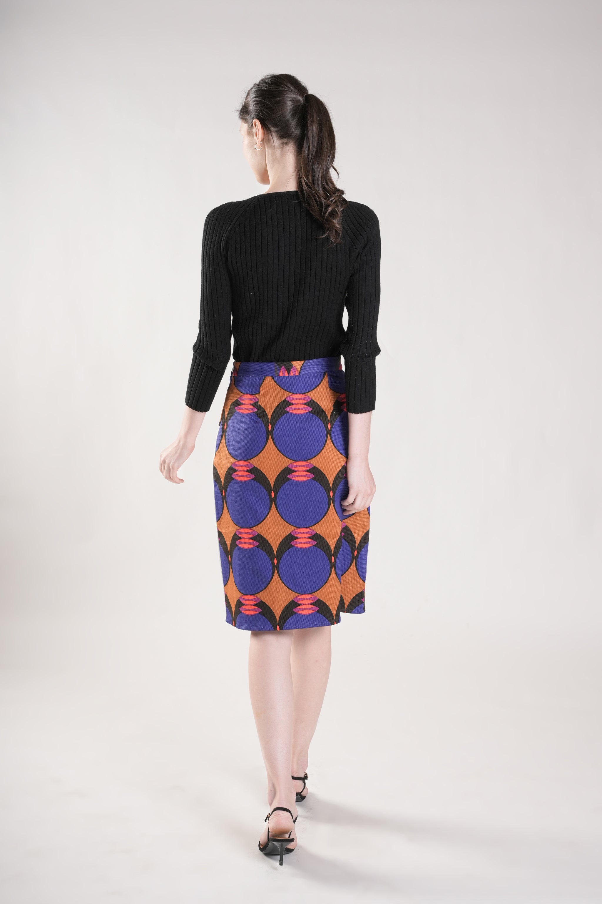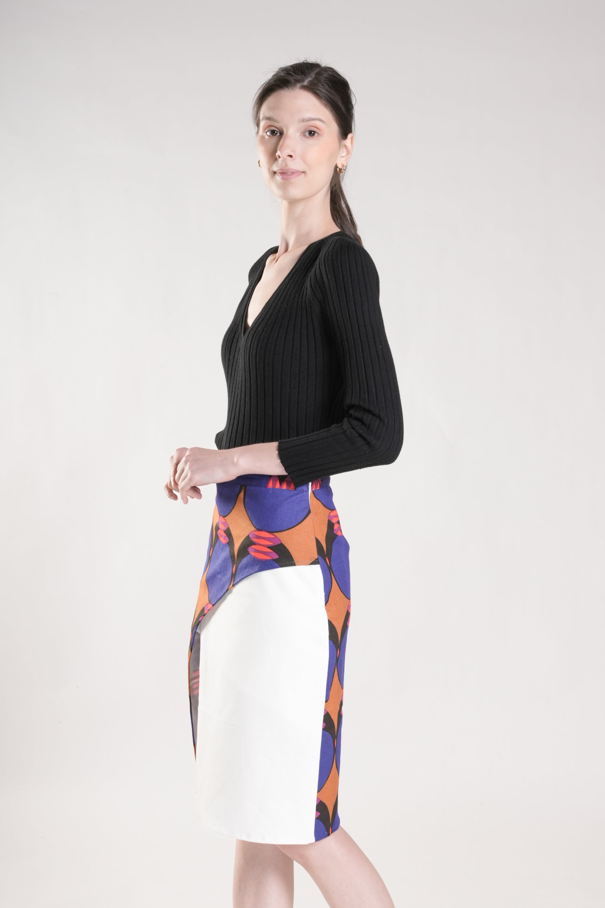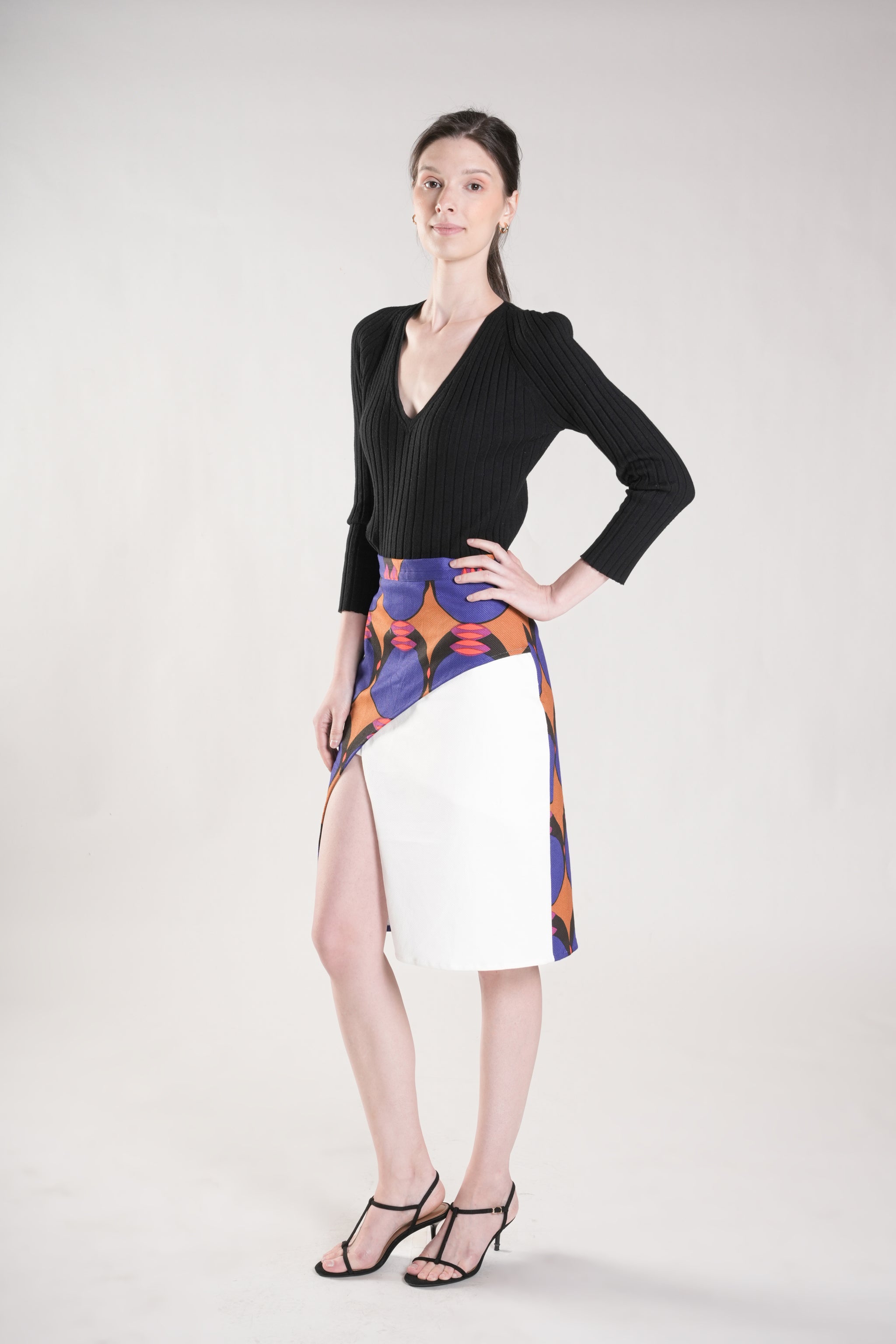This refined faux overlap skirt features a sleek silhouette enhanced by a curved front panel. The design combines plain and printed twill fabrics, creating sophisticated visual contrast and depth. A discreet back zipper ensures a polished finish. Style with a minimalist top and let this distinctive piece make a statement.
