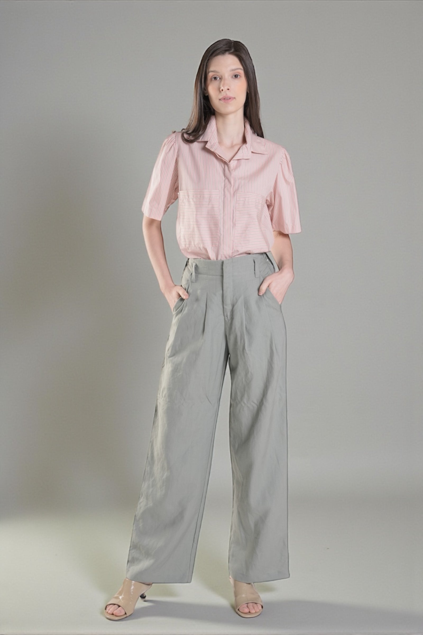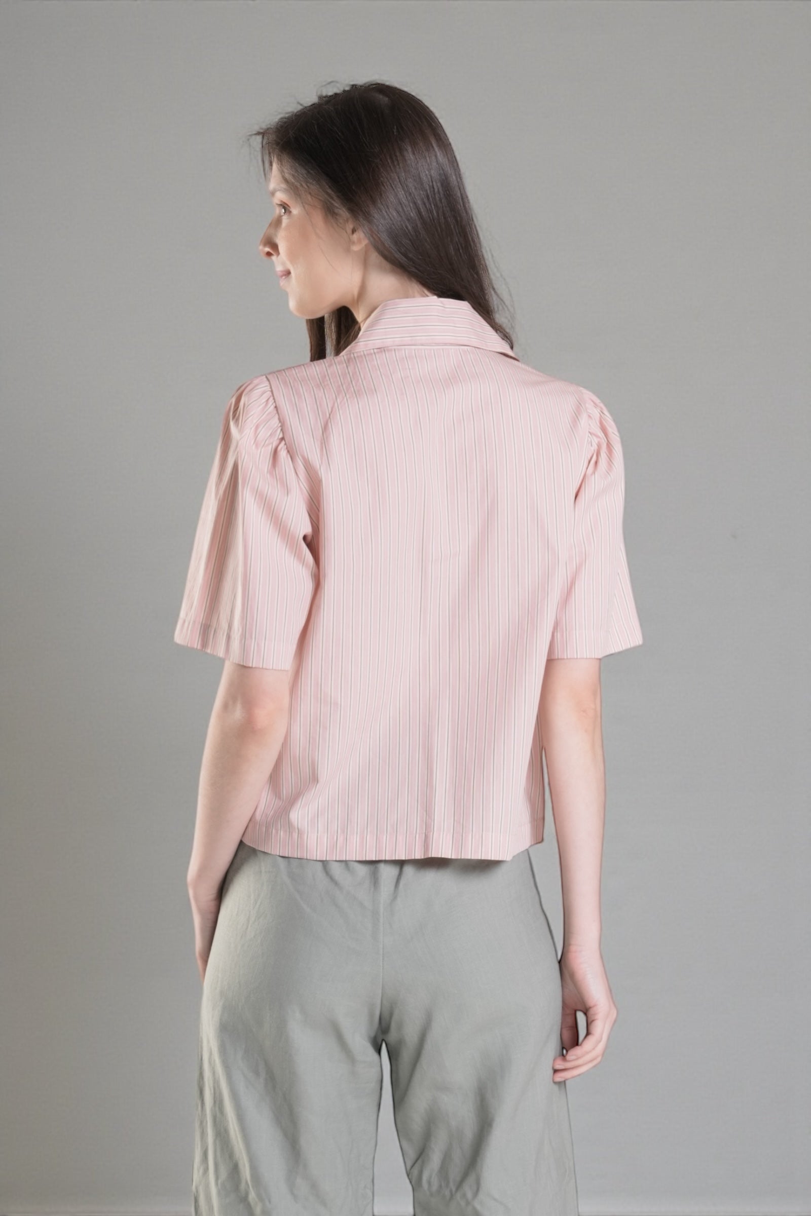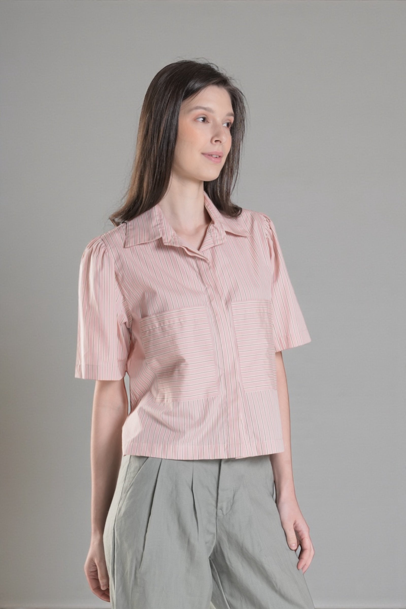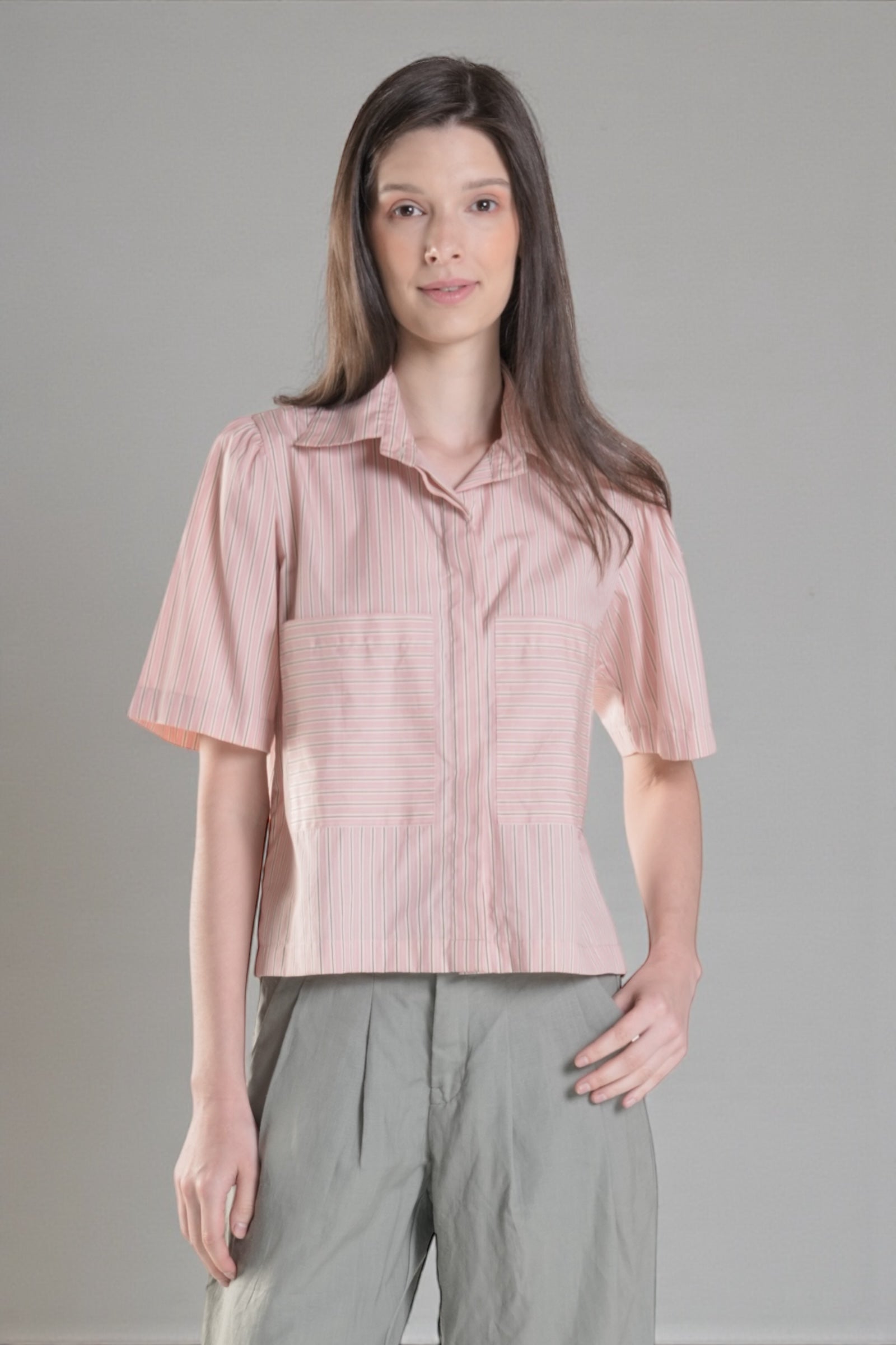 The HAWTHORNE Button Down Top combines effortless sophistication with playful design details. This semi-cropped style features a hidden placket for a streamlined look, paired with two functional front pockets. Delicate shirring adorns the sleeves, creating flattering volume and movement. The hemline sits just below the waist for a modern, balanced silhouette. Crafted from printed cotton fabric.