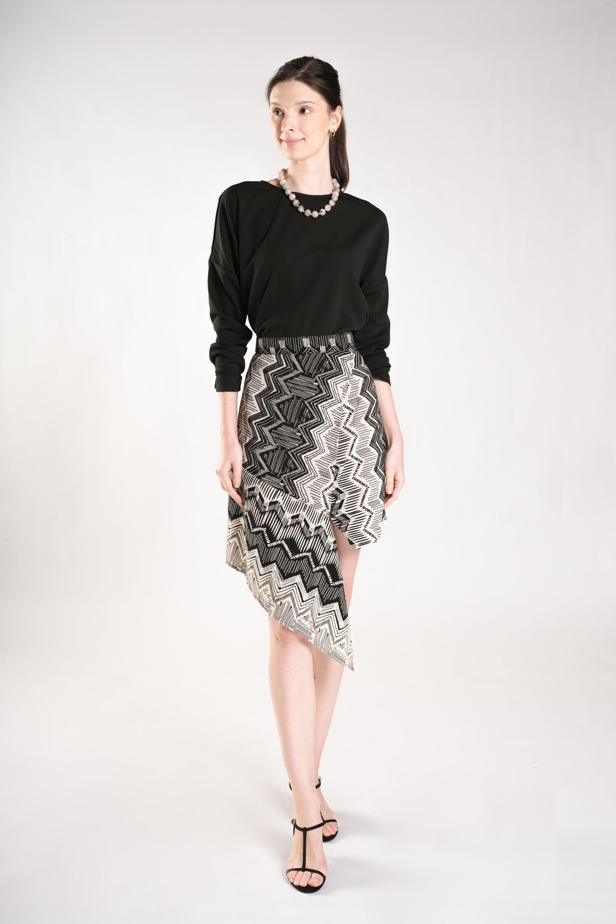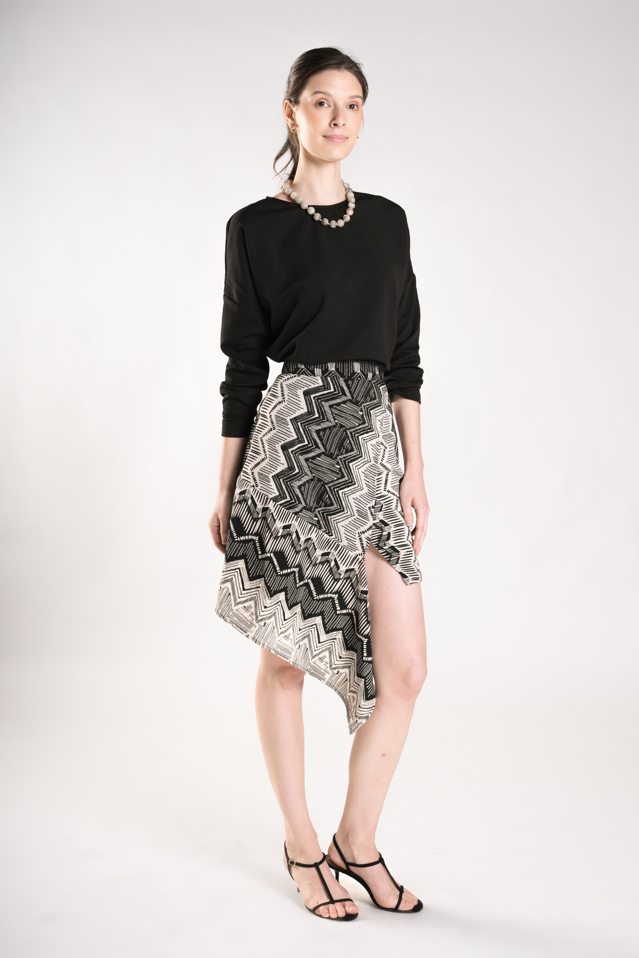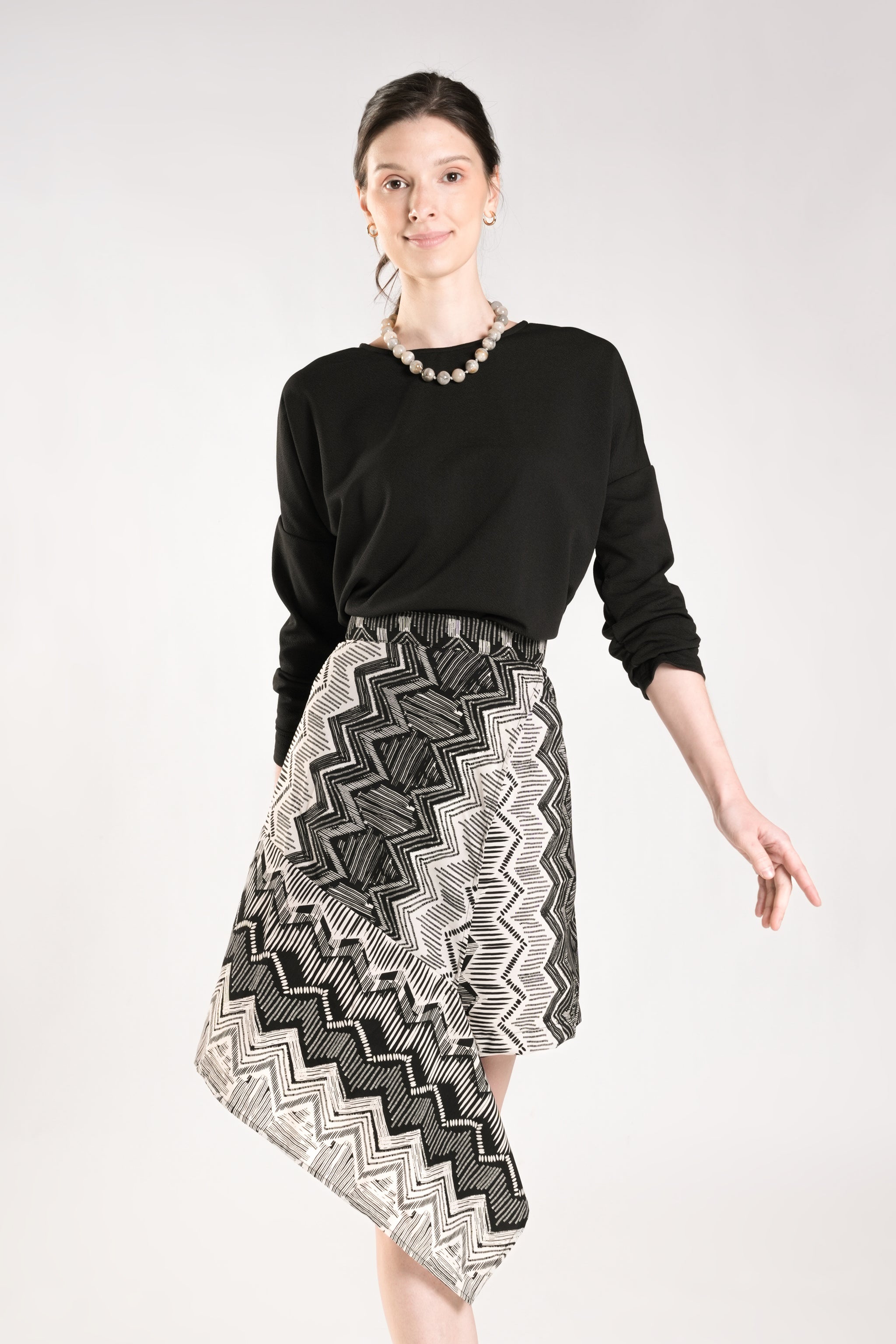 Crafted from lightweight micropeach fabric, this A-line skirt features a refined silhouette with a structured waistband. The distinctive geometric cutout detail at the front adds contemporary elegance, while a discreet back zipper ensures a seamless fit. Perfect for elevating your everyday wardrobe with understated sophistication.