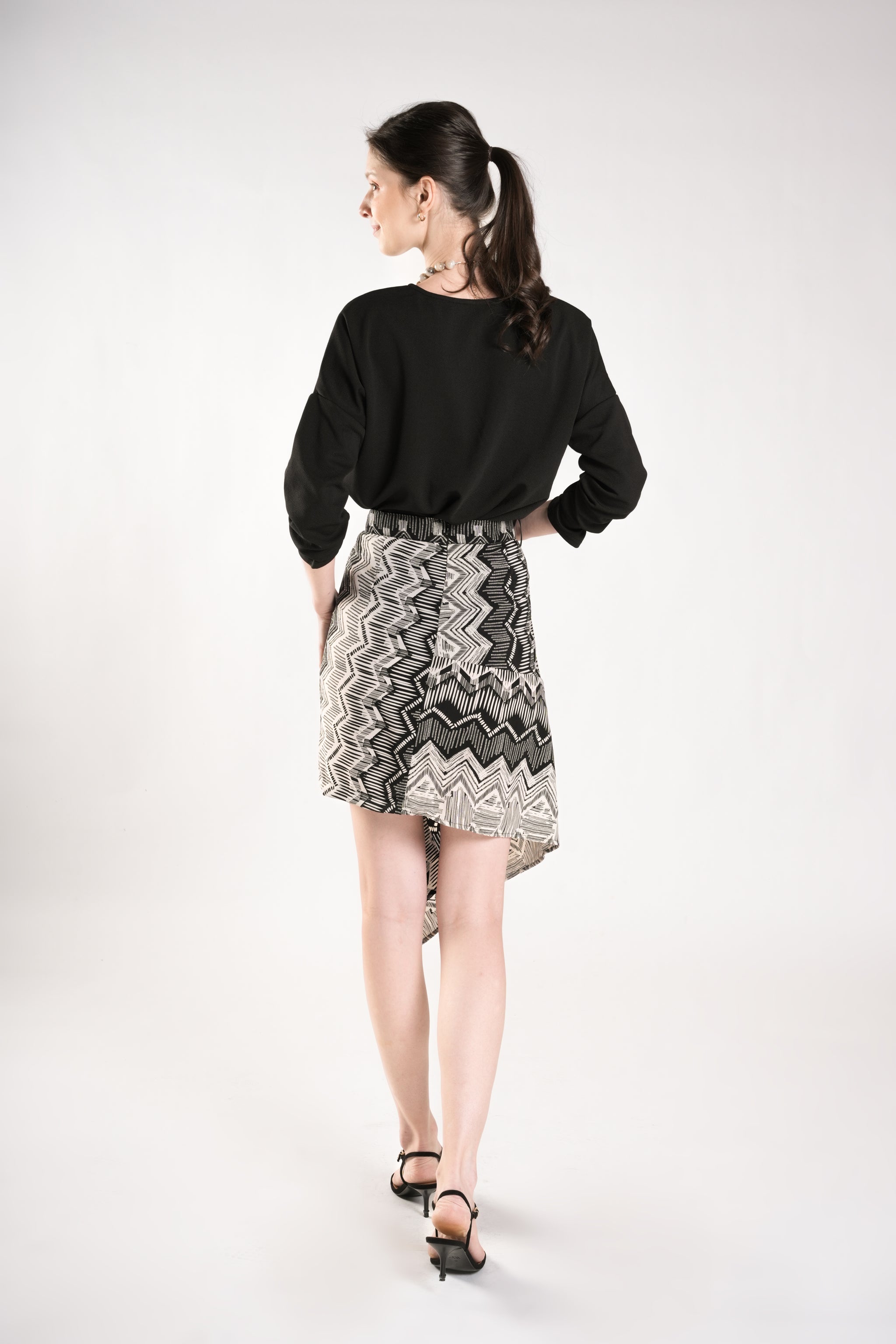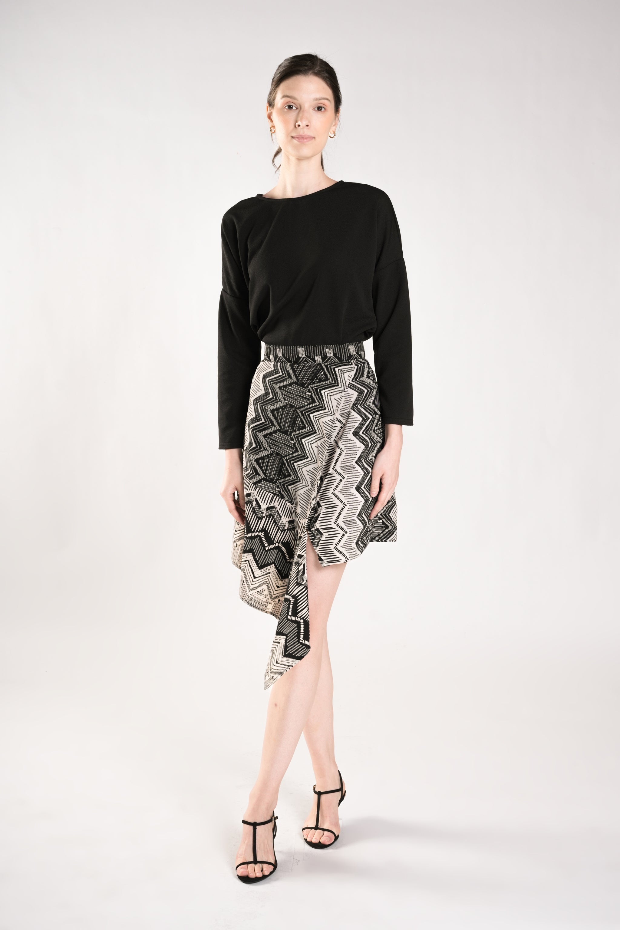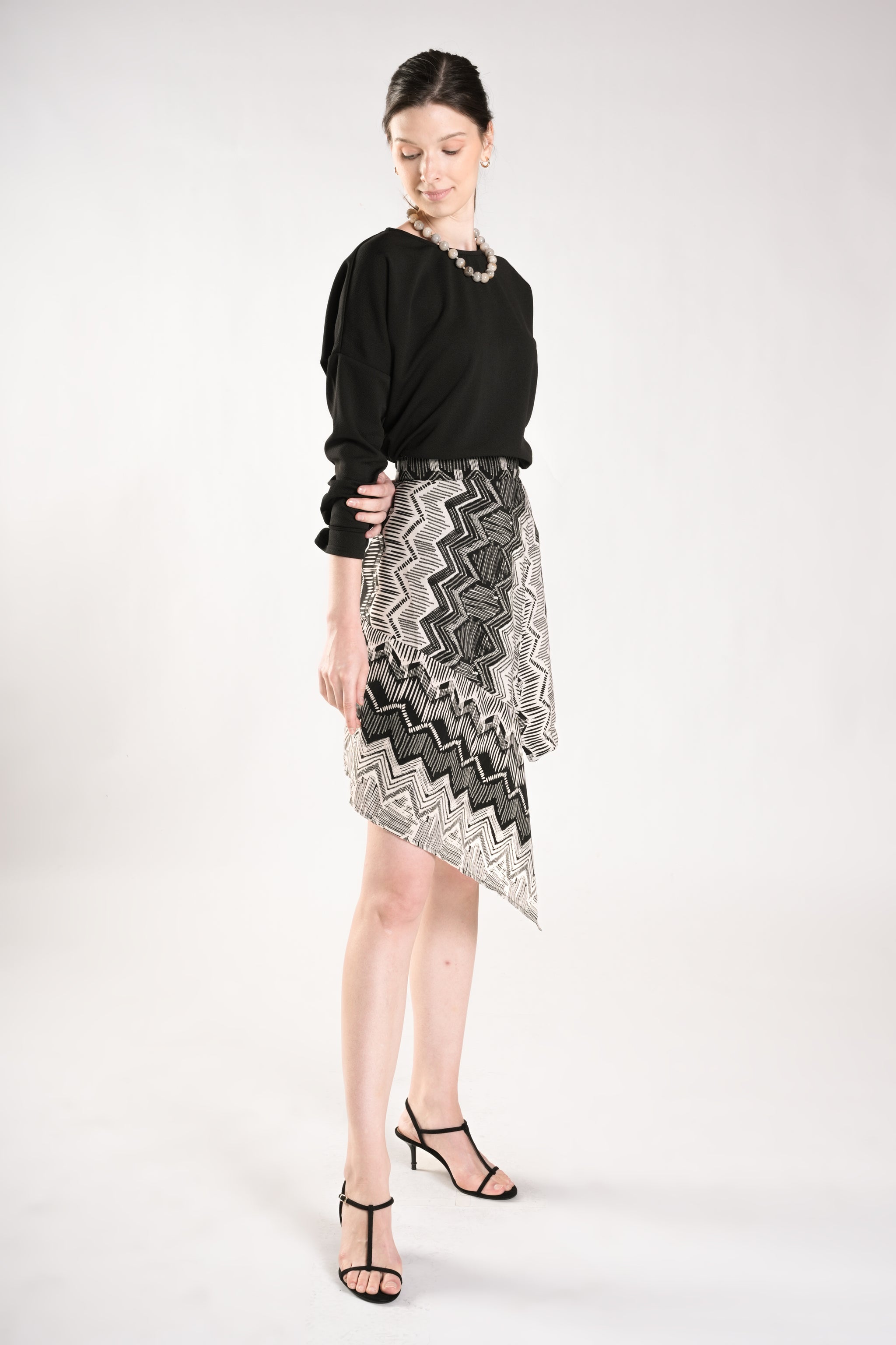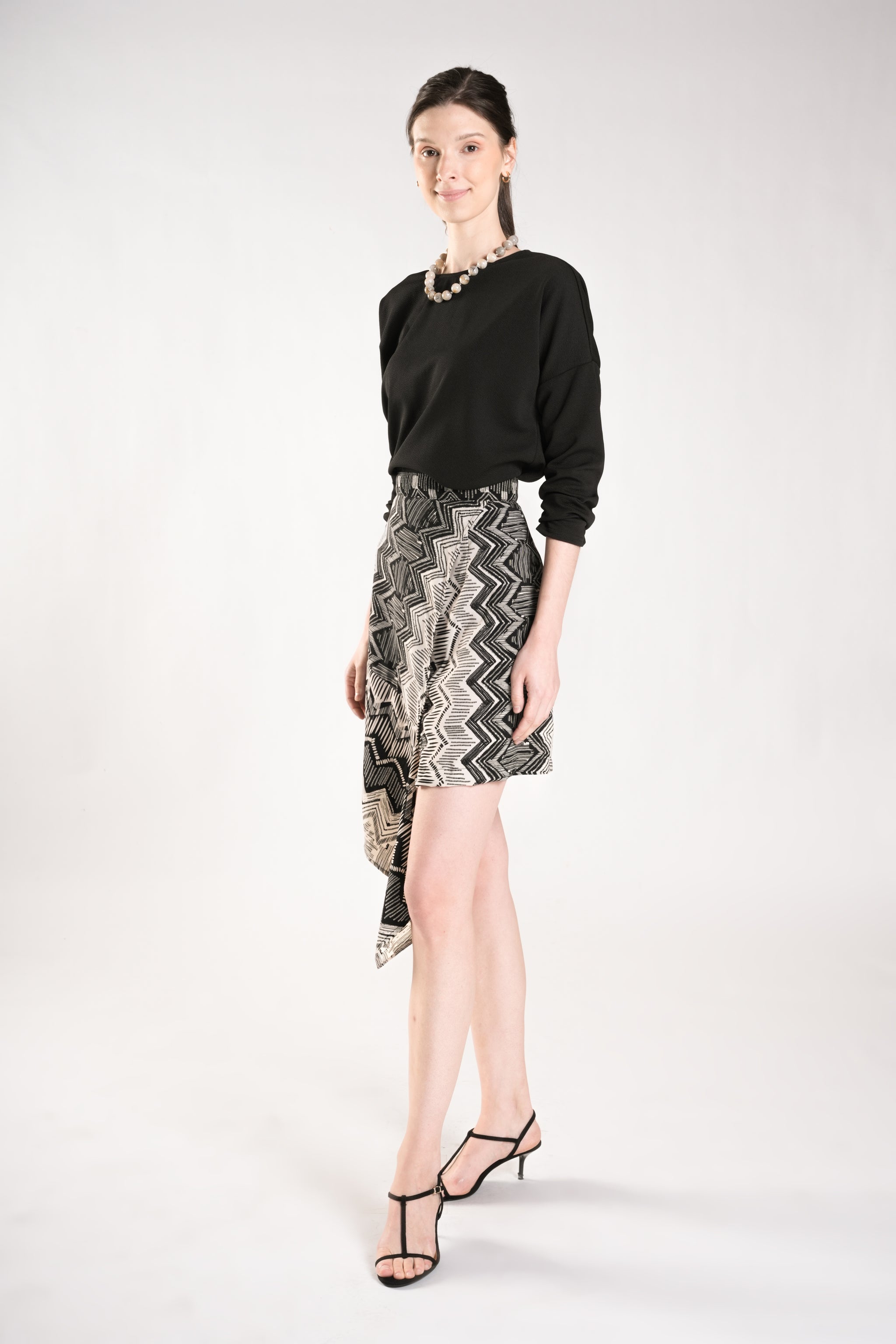 Crafted from lightweight micropeach fabric, this A-line skirt features a refined silhouette with a structured waistband. The distinctive geometric cutout detail at the front adds contemporary elegance, while a discreet back zipper ensures a seamless fit. Perfect for elevating your everyday wardrobe with understated sophistication.