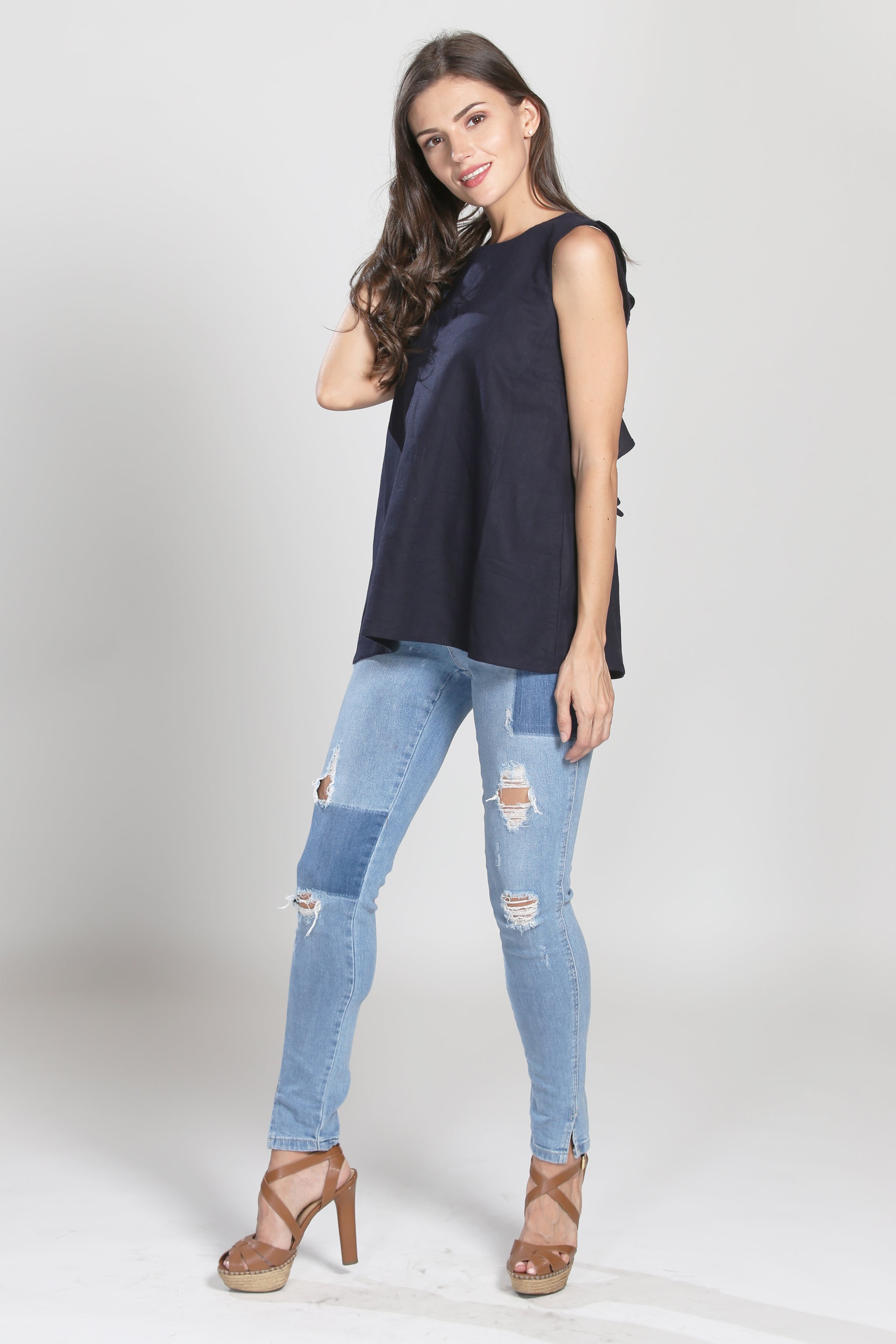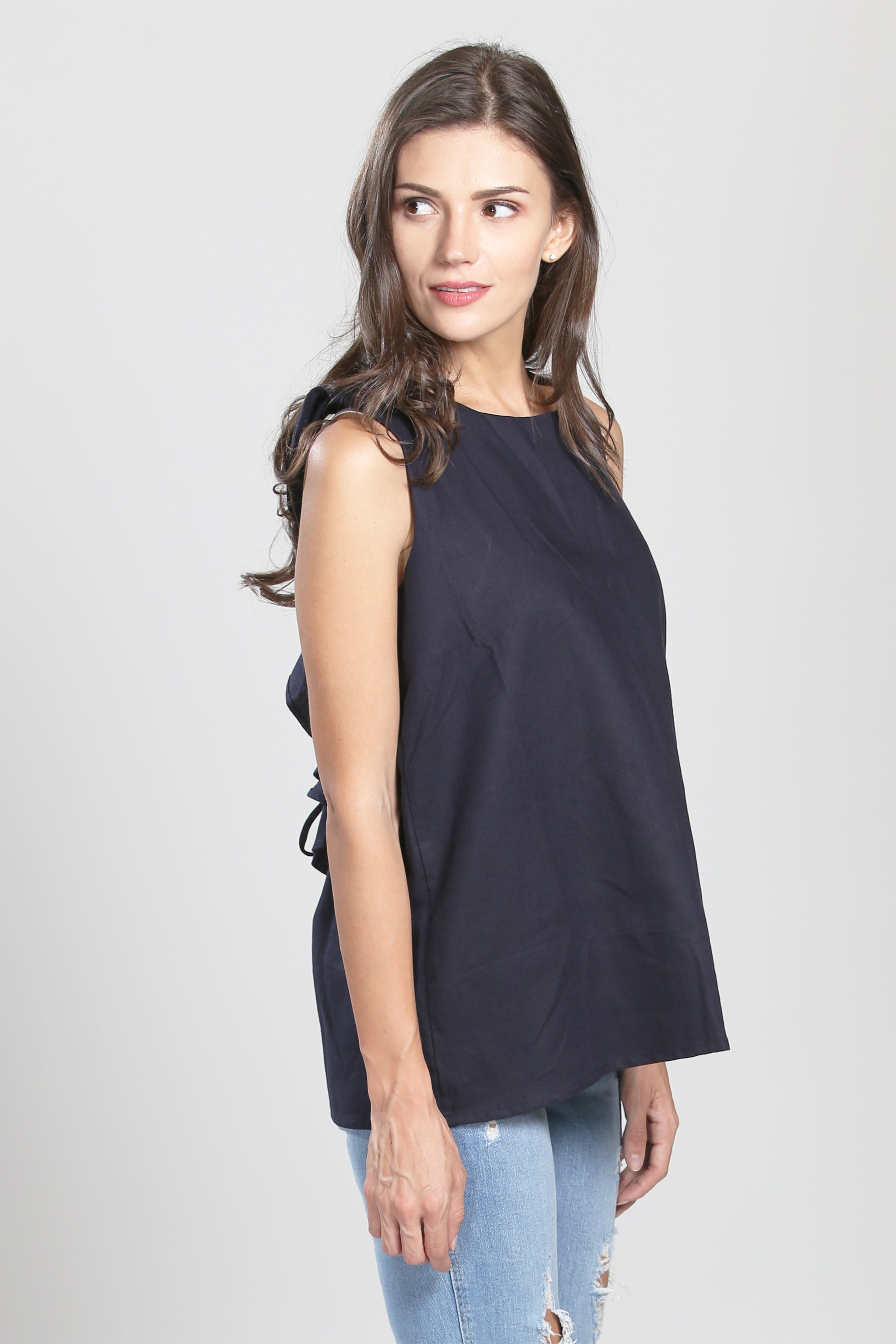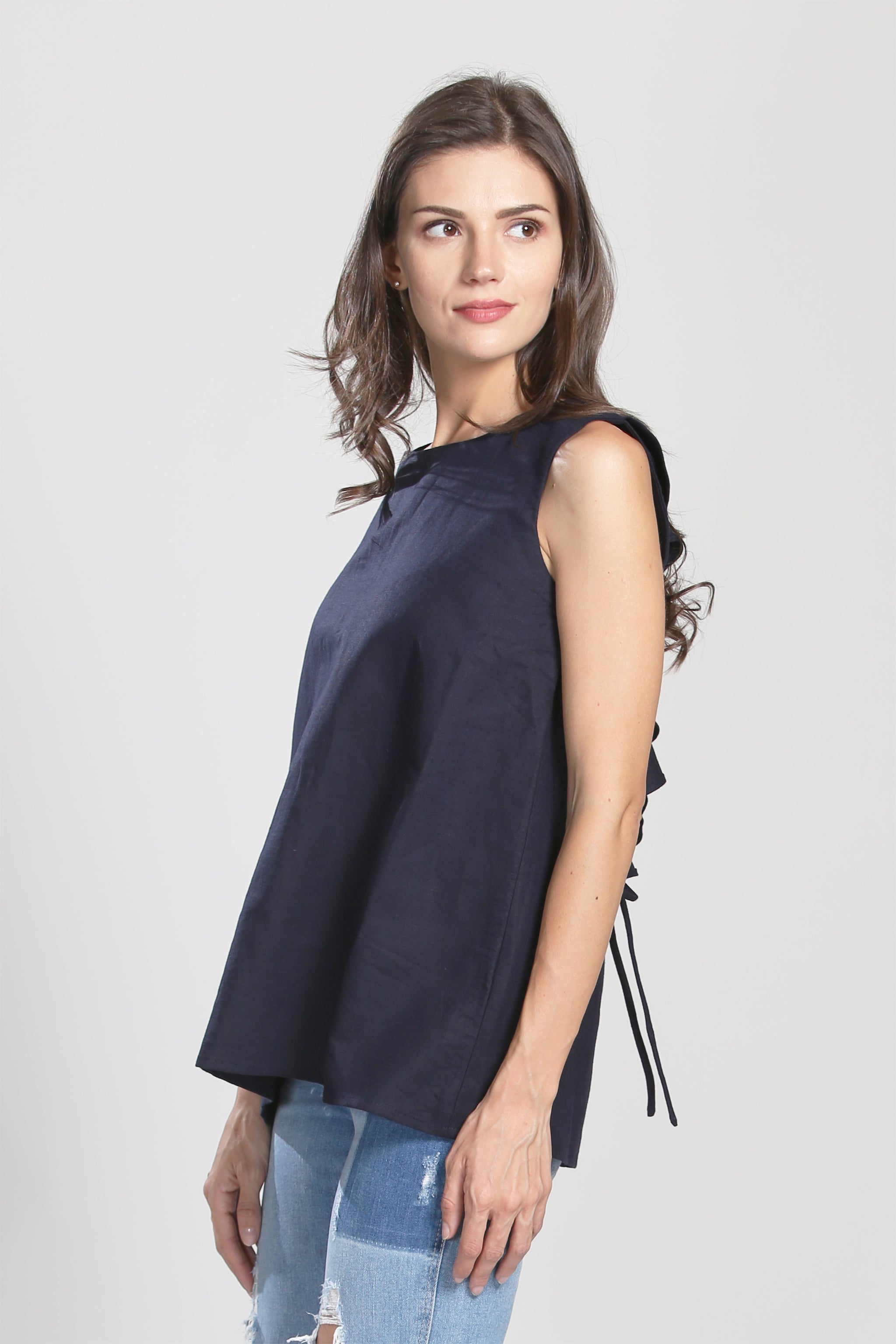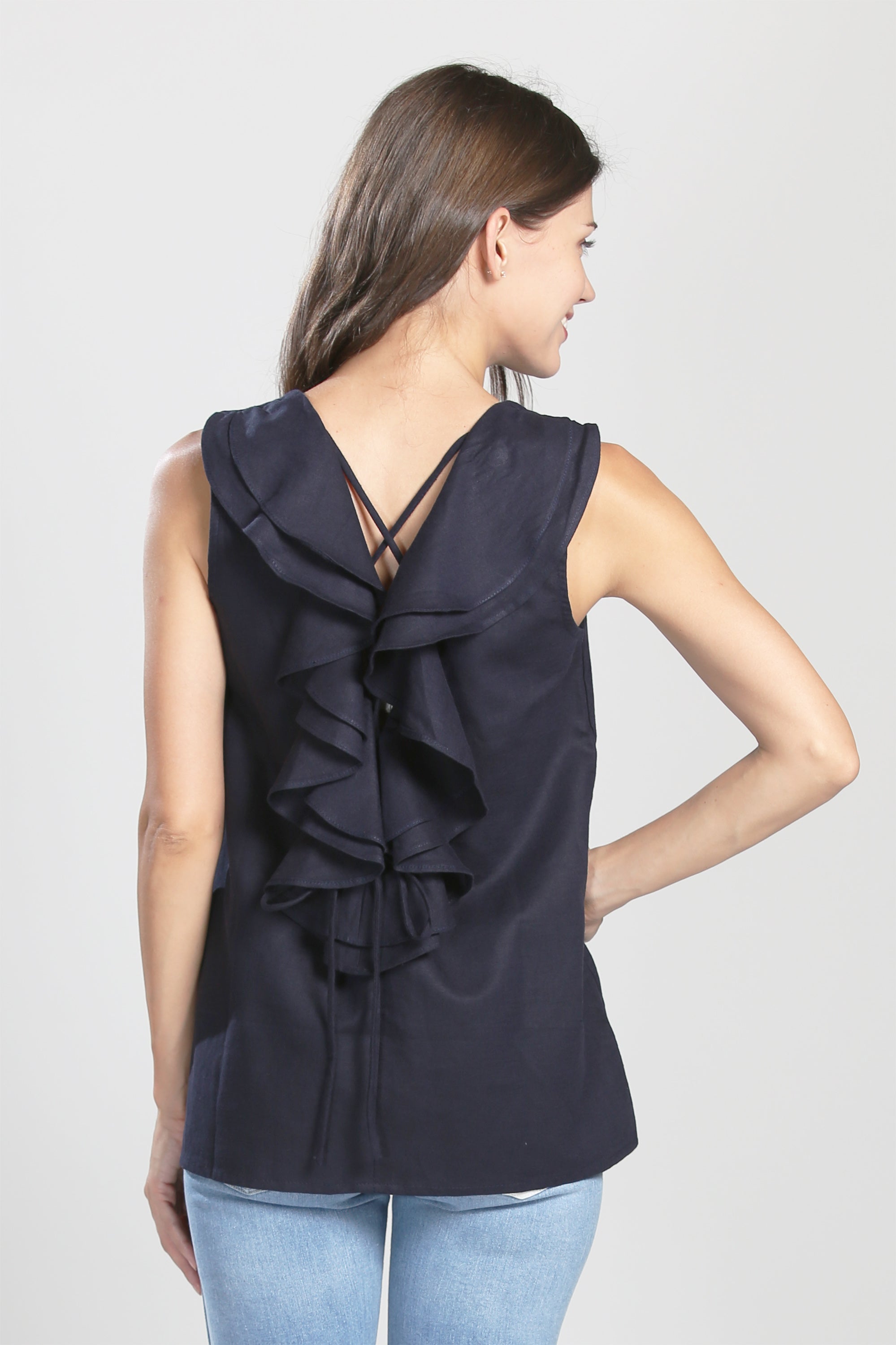Sleeveless top with ruffle detail on back and self tie ribbon for adjustment